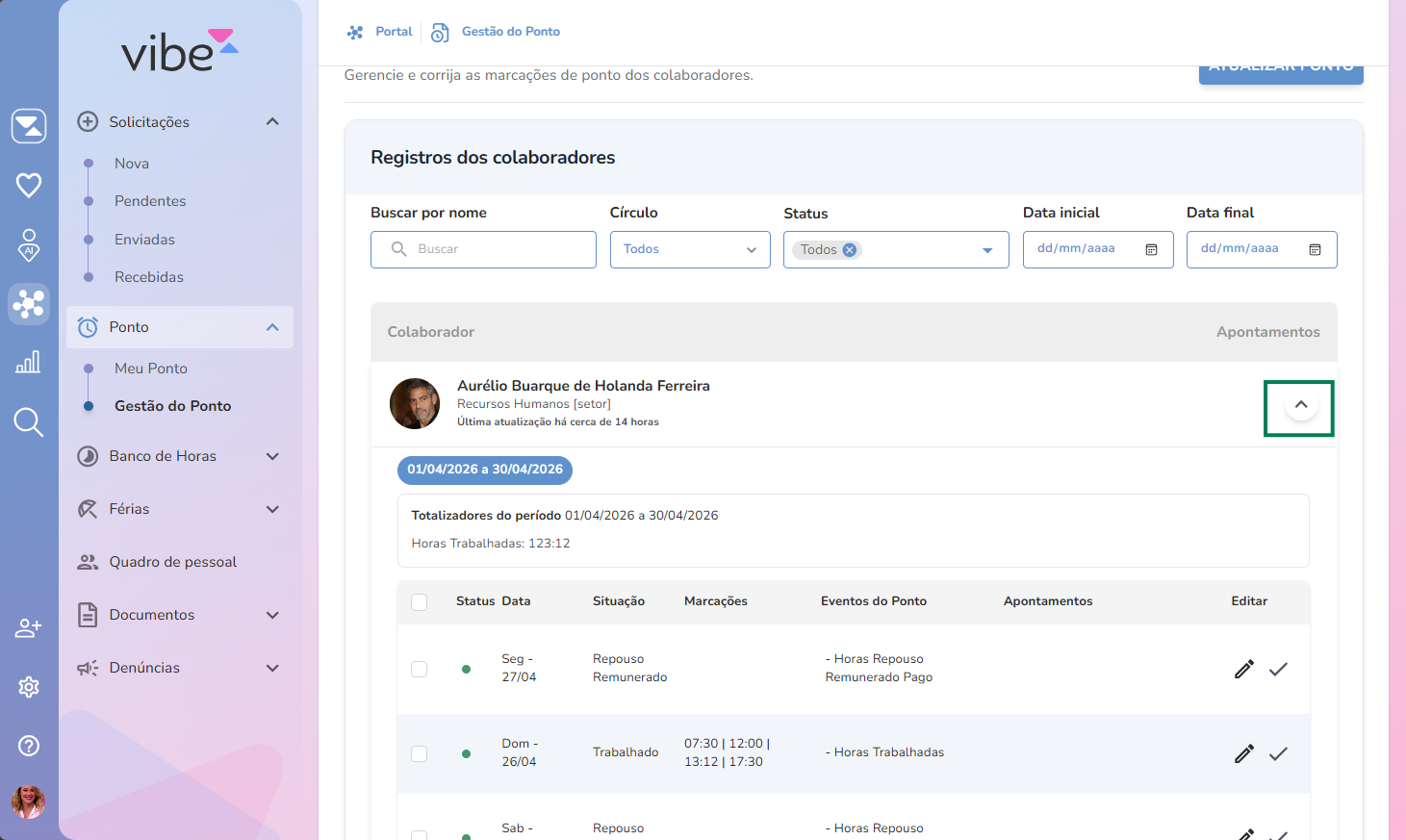 Para visualizar o ponto do colaborador é clique no botão para expandir o colaborador.