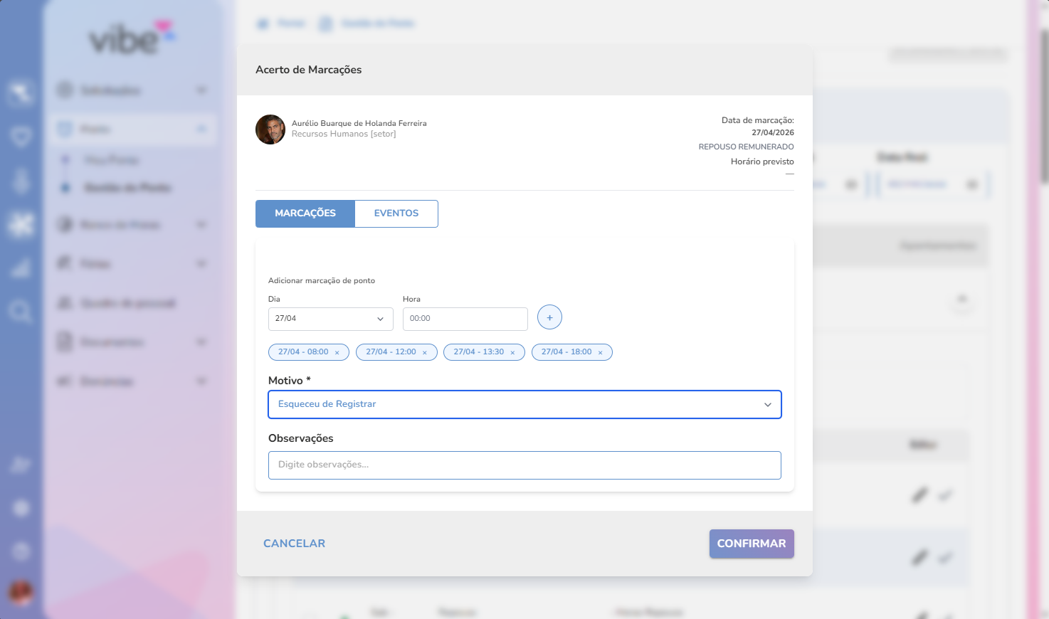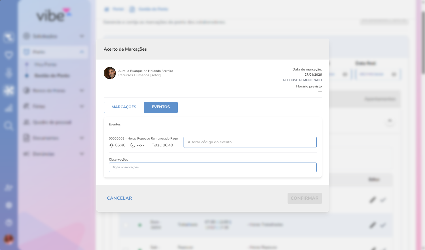 Para realizar um acerto de ponto, clique em Acerto de Marcação (representado pelo ícone do lápis). Em seguida, selecione se deseja editar Marcações ou Eventos e, após informar os dados, clique em Confirmar.