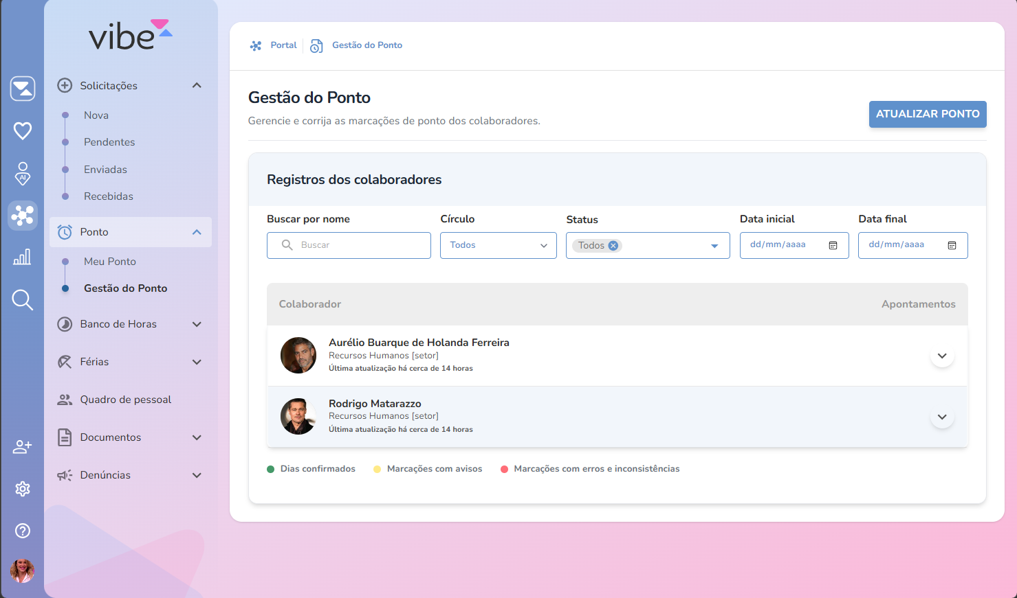 Observação: O período de ponto que aparecerá, é conforme o que está configurado na folha cadastrada. Além disso, o VIBE Portal possui cinco dias de tolerância (configuráveis em VIBE > Configurações > Segurança e Acessos > Portal) para acertos de períodos já finalizados.