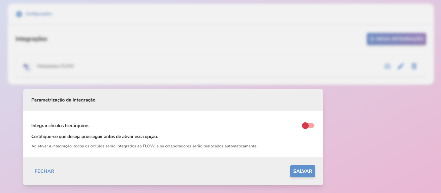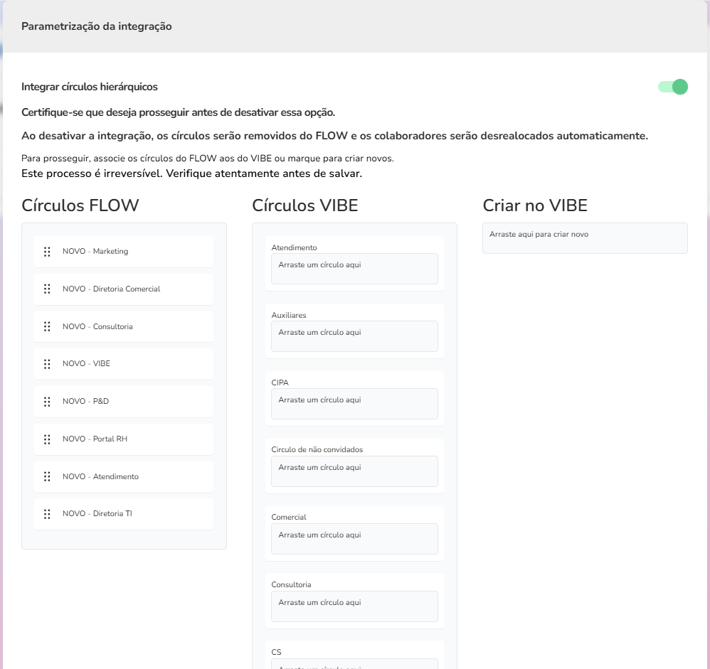 - Ao ativar a integração, o sistema exibirá os círculos hierárquicos cadastrados no Flow, permitindo que você: