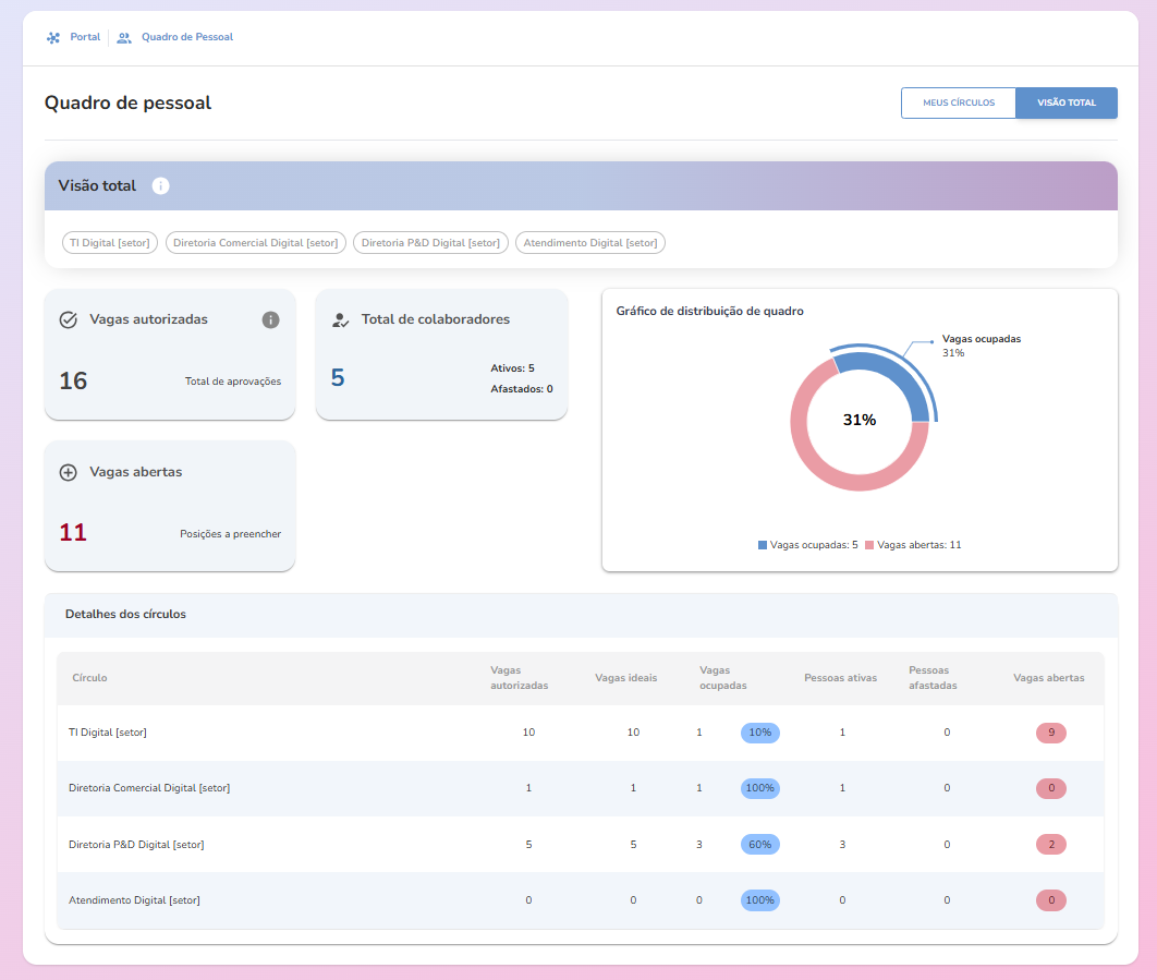 Com essa ferramenta, os líderes podem visualizar a composição atual de seus círculos e dos círculos subordinados, identificando gargalos, excesso ou falta de pessoas e comparando a composição ideal x atual de forma prática e estruturada.