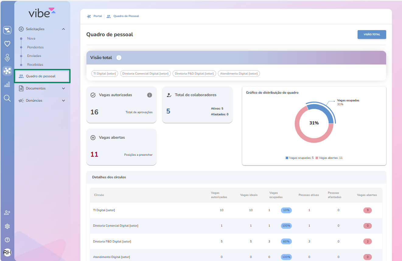Após essa ativação, o Quadro de Pessoal ficará disponível no menu VIBE > Portal > Quadro de Pessoal.