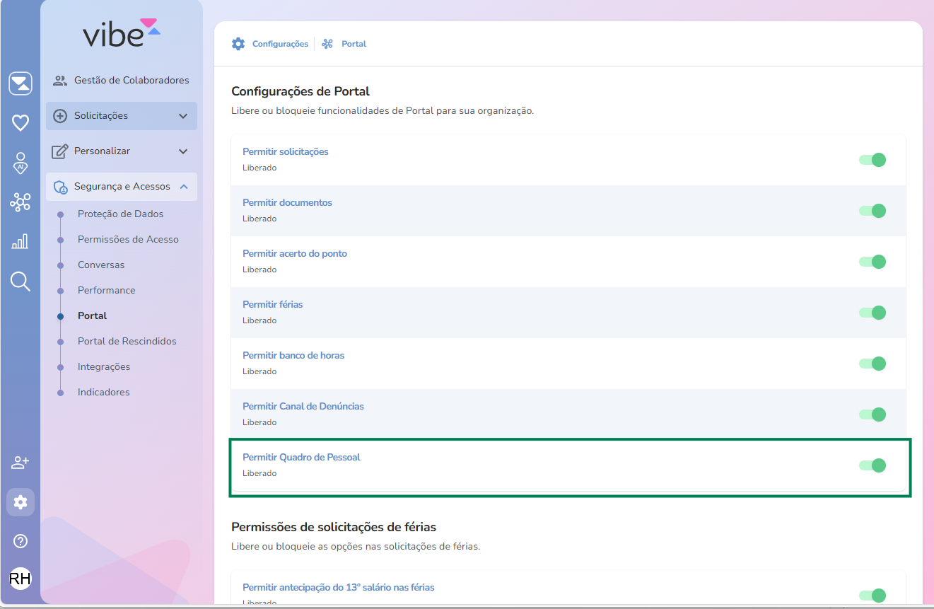 Para disponibilizar o Quadro de Pessoal, o administrador do sistema deve ativar a organização para utilizá-lo. Para isso, é necessário acessar o menu VIBE > Configurações > Portal e habilitar a opção Permitir Quadro de Pessoal.