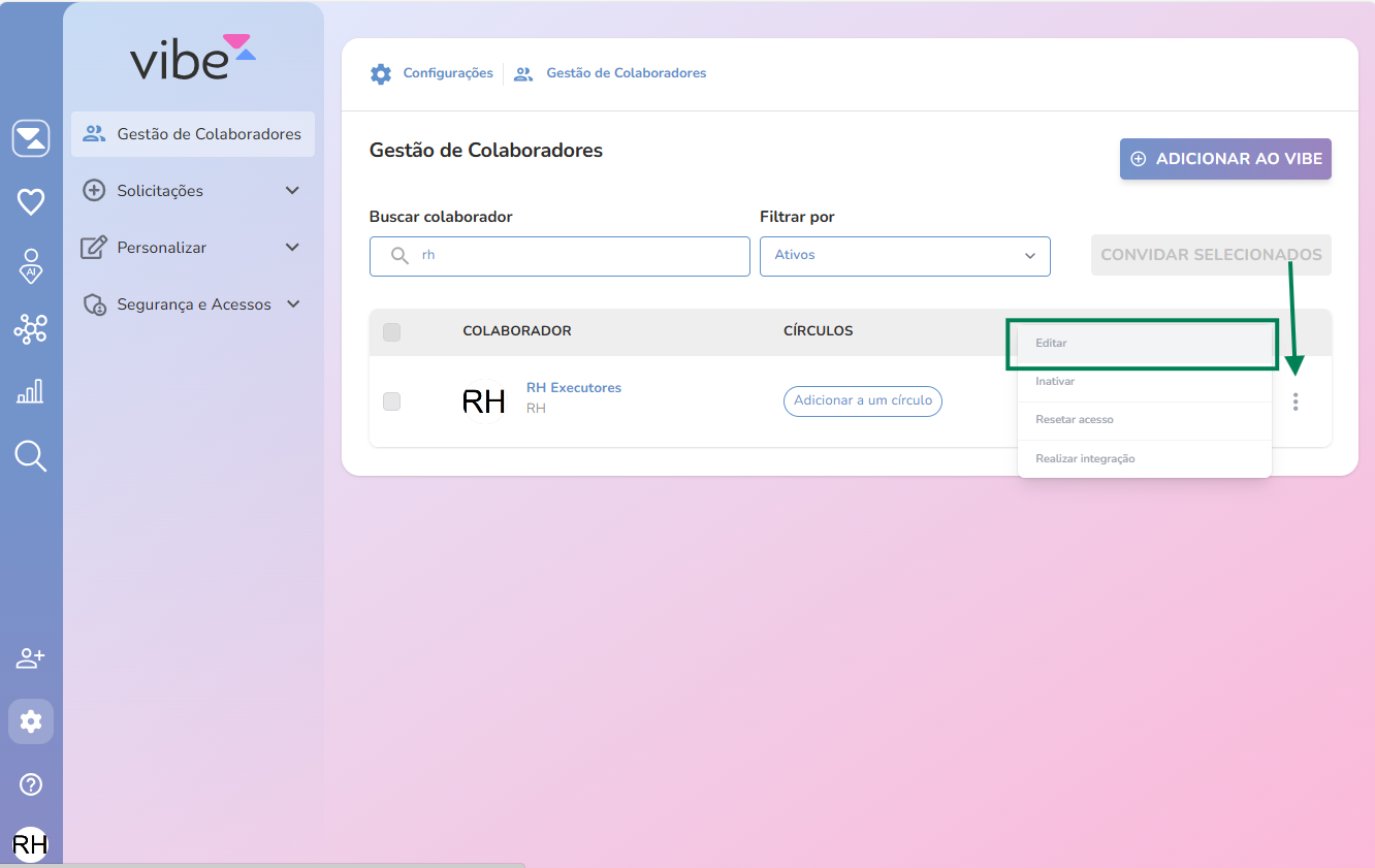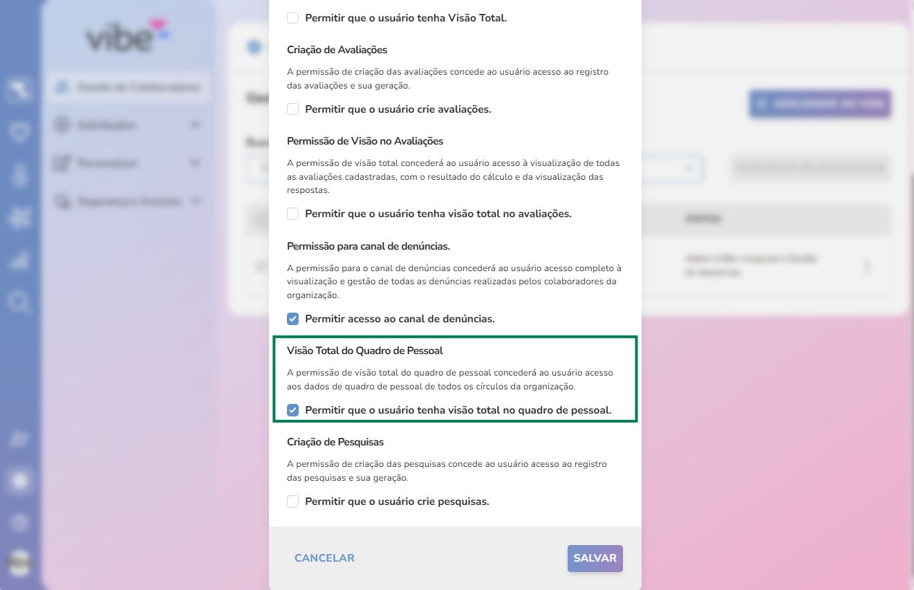 Além disso, é possível configurar determinados usuários para que tenham acesso total ao Quadro de Pessoal de toda a organização. Para realizar essa configuração, o administrador do sistema deve acessar o menu VIBE Configurações Gestão de Colaboradores, localizar o usuário desejado, editar seu cadastro e marcar a opção “Visão Total do Quadro de Pessoal”.