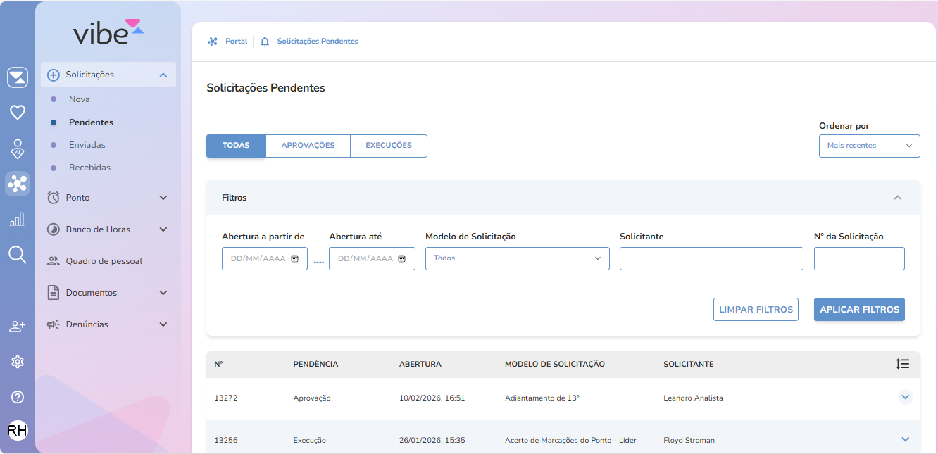 O VIBE agora disponibiliza filtros mais específicos para solicitações pendentes, permitindo que lideres e administradores encontrem as solicitações e utilizem a funcionalidade de aprovação e execução coletiva de forma direcionada.
